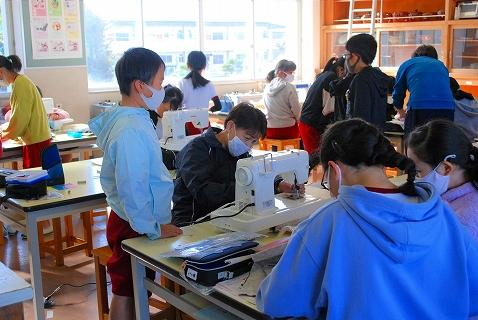 5年生家庭科の授業の様子です。ミシンを使ってランチョンマットを作っています。校長先生も一緒に指導してくれています。