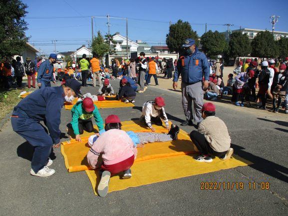 【毛布を使って担架を作り、実際に搬送を行っています】