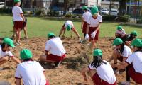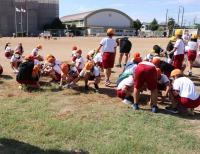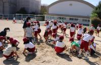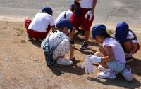 また、今年度より、やまもも班(縦割り班)対抗の競技を取り入れました。赤白に分かれての練習も運動場の実際のコースで行いました。「互いに声をかけ合うんだよ」「違う学年の子ともたくさん話をして、作戦を練ろう」そんなアドバイスが指導の教員からありました。学校にあった道具をうまく使っていろんな方法でボールを運びます。初日の今日はまだぎこちないところがありましたが、今後、練習を重ねていくうちに仲間意識が高まり、コミュニケーションを取りながら力を合わせていけるようになることでしょう。