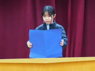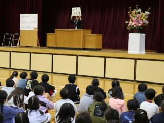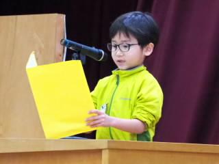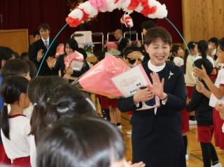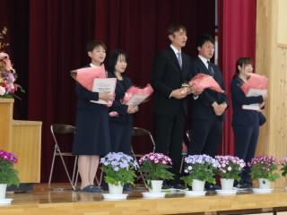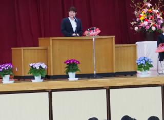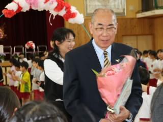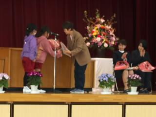 代表児童がお礼の言葉を述べ,花束をお渡ししました。その後、お一人お一人からお別れの言葉をいただきました。先生方からは,「いろんなことにチャレンジしてほしい」や「友達と協力して取り組んでほしい」などと激励の言葉をいただきました。
