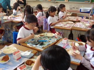 4月16日から,1年生も給食が始まりました。どの子も,「おいしい。おいしい。」と食べていました。みんなで楽しく会食をしました。
