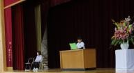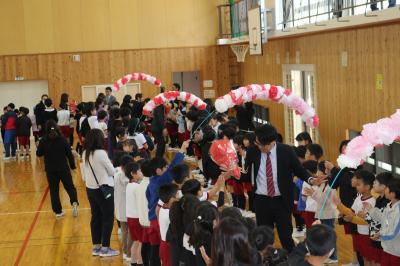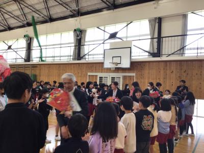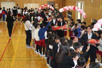 代表児童がお礼の言葉を述べ、花束をお渡ししました。転任された先生がたからは、近況報告、みなさんとの思い出話などを話していただきました。「元気いっぱいにがんばってほしい」「地域のかたにも笑顔でよい挨拶を」といったエールのお言葉もいただきました。
