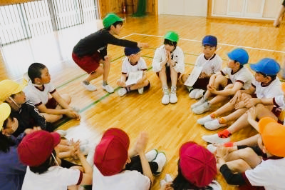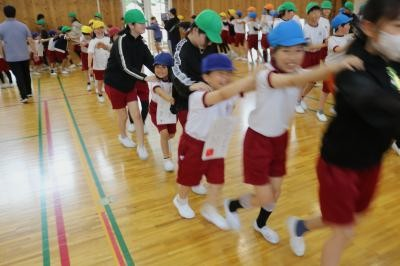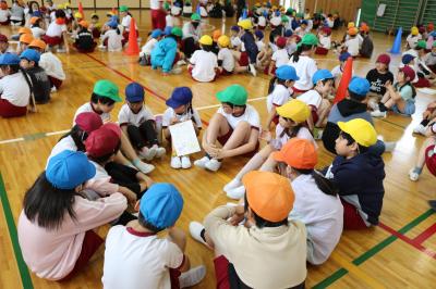 今年度は、体育館での実施です。班長が1年生を紹介した後、やまもも班に合流しました。まずはペア学年で名前を覚えることが今日の目標です。〇✕クイズをしたり、じゃんけん列車をしたりして仲よく過ごしました。遊びの感想を聞くと、「楽しかった」「仲よくできた」といった声がたくさん上がりました。最後に、班ごとに集合写真を撮りました。