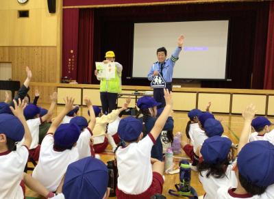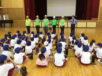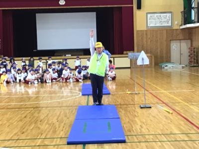 あいにくの天候で体育館での実施となりましたが、道路の歩き方や横断歩道の渡り方などについて、丁寧に教えていただきました。今日の学びを生かして、安全に登下校をしてほしいと思います。