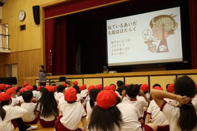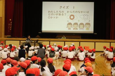 講師に、栄養教諭の夏目先生をお迎えし、朝ごはんの大切さ、理想の朝ごはんなどについて、クイズをまじえて教えていただきました。しっかりと朝ごはんを食べてくると、学習内容もしっかりと身につくそうです。手軽に用意できるものでよいので、バランスよく食べる習慣がつくとよいです。保護者のかたも参加してくださいました。ぜひ、この日のことをご家庭でも話題にしていただけるとよいと思います。