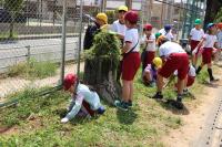 前日に予定していましたが、天候不順のため、翌日に延期をしました。雨あがりのせいか、草も抜きやすく、暑い中ではありましたが、やまもも班に分かれてみんなで協力し、運動場や校舎のまわりをきれいにすることができました。