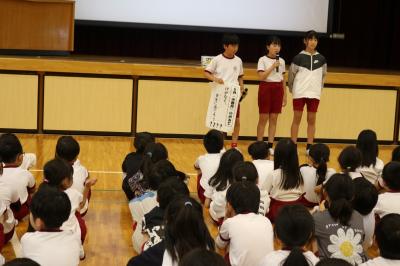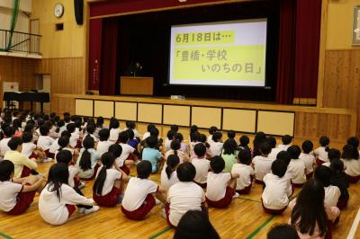 校長から、6月18日の「豊橋・学校いのちの日」について講話がありました。最後に、やなせたかしさんの「ぼくらはみんな生きている」の歌詞も紹介しました。執行部からは、今月のめあてが発表されました。「けがなく、安全にすごそう」です。教職員も子どもたちも、いのちについて・いのちを守ることについて、いつも以上にしっかりと考える6月にしていきます。