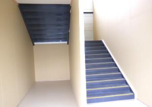 校舎ほぼ中央にある階段です。鉄板のままですが、表面のデコボコや黄色の滑り止めのおかげで、滑りにくく安全です。写真左側の階段下の部分には手洗い場が設置される予定です。【673】