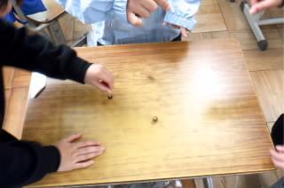 生活科の授業で、1年生がどんぐりごま作りに夢中になっていました。作り終えた子どもたちは、できるだけ長く回るように工夫して回しながら友だちと楽しく遊んでいました。【674】