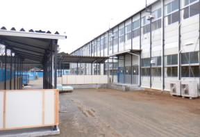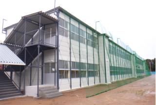 運動場から見たプレハブ校舎です。全面が防球ネットに覆われています。【679】