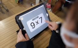 2年生の九九の練習でもタブレット端末が活用されています。画面に表示される式の答えを瞬時に確認でき、大変効率的な学習ができます。【680】