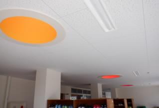 昇降口の天井に元々あった採光のための3つの天窓が、とても明るい「黄」「オレンジ」「赤」の3色に塗り分けられました。登校する子どもたちに、朝から活力を与える色だと思います。【797】