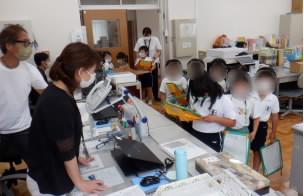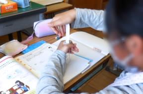 4年生の理科の授業の様子です。注射器に閉じ込めた空気に力を加えた時の、手ごたえや体積の変化等について、予想をした後で、一人一人が思い思いに実験を繰り返していました。【798】