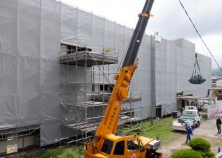 北校舎東側の改修工事が順調にすすんでいます。シートで覆われた校舎の中に、大型クレーンでたくさんの資材が搬入される迫力ある光景は、ついつい見入ってしまいます。【799】