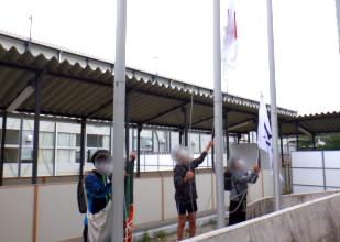 改修工事の第1期中は立ち入れなかった掲揚塔ですが、第2期からは使用可能になりました。当番の運営委員が、旗がロープにからまないように注意しながら、毎朝真剣に揚げています。【801】