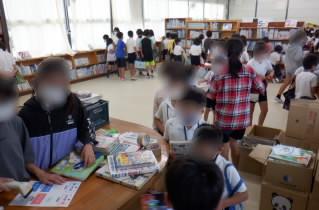 プレハブ校舎に移動した図書室が7月4日から開館しています。写真は先週の様子ですが、本を借りようとする子どもたちが長蛇の列を作っていました。【800】