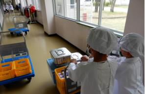 1年生の給食当番が食缶や食器を乗せた台車を押していました。配膳室から教室までの廊下を、友だちと協力しながら上手に押せるようになってきました。【553】