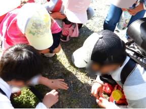 登校した子どもたちが、下駄箱の前で輪になって座っていました。近寄ってみるとかわいい手の上にかわいいテントウムシがいました。子どもたちはテントウムシに夢中でした。【555】