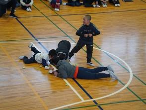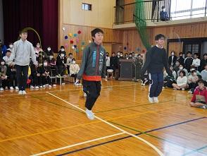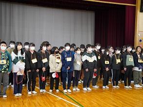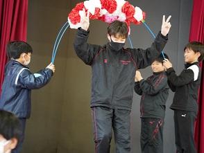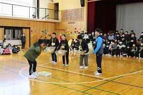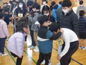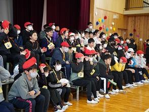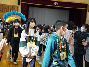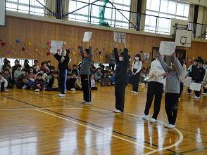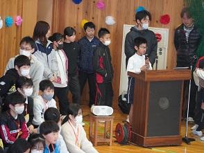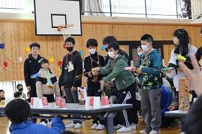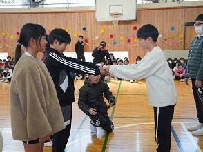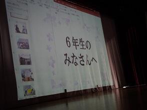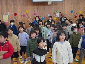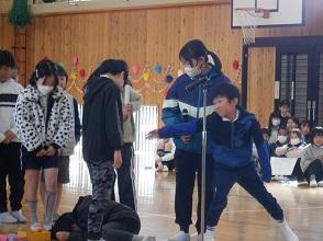 3月1日、5年生の実行委員が運営し、「さよなら集会」を開催しました。1年生は写真・メッセージ付きメダルを制作してプレゼントしました。体育館に入場してきた6年生は、メダルを首にかけてもらいうれしそうでした。2年生は、手作りの射的を用意し、楽しんでもらいました。3年生は、「パワー」のパフォーマンスで一緒に盛り上がりました。呼びかけやリコーダー演奏もしっかりできました。4年生は、お笑いと二重跳び対決、なつかしい思い出クイズで楽しみました。5年生は、会場準備や会の運営、思い出のスライドを製作し、6年生から学校のリーダーとしての引継ぎをしました。全校での歌「変わらないもの」のプレゼントもあり、とても心温まる会となりました。【1045】