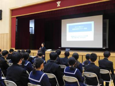 講座の最初には「マナーは相手に対する敬意を表すもの」と示され、爽やかな挨拶・返事の仕方や座り方・礼の仕方などの基本的なことから、正しい敬語や気持ちのよい言葉遣いまでさまざまなことを教えていただきました。講座の最後には「人の行動は意識1%、無意識99%」と言われ、学校生活から習慣化させることの大切さも教わりました。