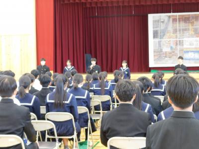 いよいよ職場体験が迫ってきました。事前指導を行い、書記による意気込み発表、当日の注意事項確認、マナー講座の復習を行いました。