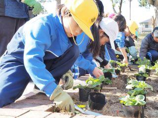 お世話になる自治会と「坪ノ谷みどりの会」の皆さんとあいさつをした後、さっそく作業に取り掛かりました。今回植えるのは、パンジーとノースポールの苗です。まず、花の苗を選び、花壇に並べていきます。