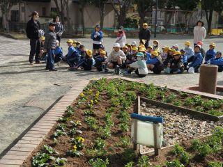 みんなで力を合わせて作業完了。3年生は、自分たちが苗を植えた花壇を見て、これから坪ノ谷公園に来るのが楽しみになったようです。