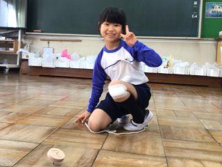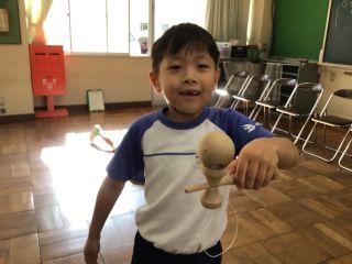「けん玉」や「こま」など、できるとうれしくて、カメラの前でポーズ。