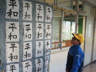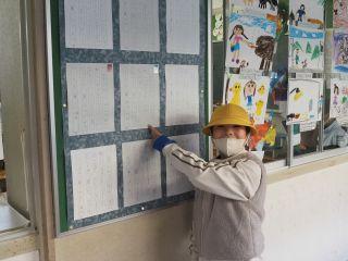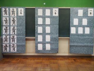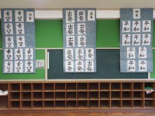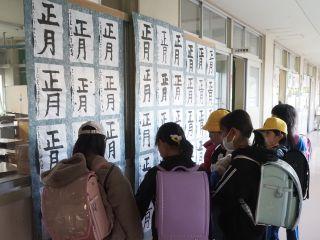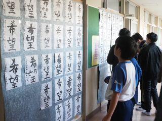 競書大会の審査が終わり作品が展示されました。子どもたちは廊下に掲示されている作品を見て、入賞したのは誰だろう、手本にそっくりに書いてすごいななど、と鑑賞していました。「先生、入賞したよ、見て」と笑顔で声をかけてくる子もいました。