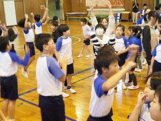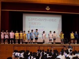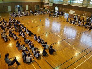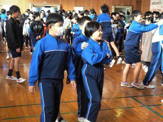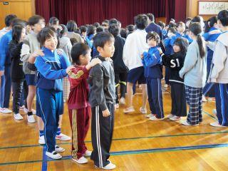 ツバミー朝会が行われました。計画委員が考えた「全校じゃんけん列車」です。音楽が終わるとじゃんけんし、どんどん列が伸びていきます。