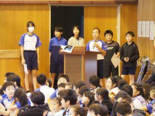 ツバミー朝会の日です。ツバミー朝会は、全校のみんなのために児童会が計画、運営する朝会です。「ツバミー」という名前は、全校から応募された案の中から選ばれたものです。