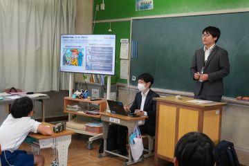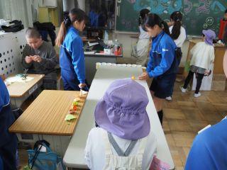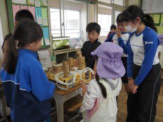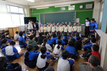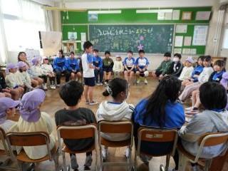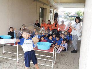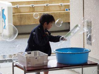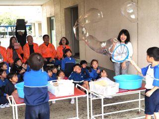 1年生がしゃぼん玉博士を招いて、自慢のしゃぼん玉を見ていただきました。材料を家から持ち寄って生活科で試行錯誤しながら作り上げた道具から一気にたくさん出てくるしゃぼん玉や長くて大きなしゃぼん玉ができると大歓声があがりました。
