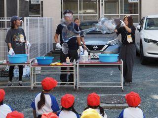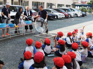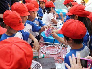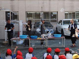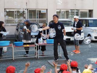 さっそく、しゃぼん玉博士がしゃぼん玉を作り出すと、次から次へと、飛んでくる大きなしゃぼん玉やたくさんのしゃぼん玉に1年生の子どもたちは大はしゃぎです。「あんなに大きなしゃぼん玉ができるの!」と初めて見る子たちはびっくりした様子。