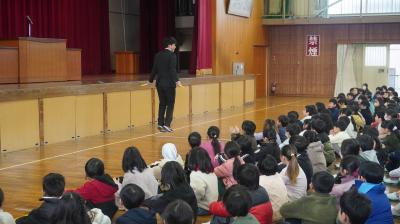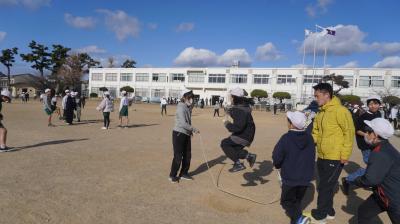 始業式の後、深城先生が「外で元気よく遊ぼう」と呼びかけ、三重跳びの実演をしてくれました。