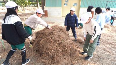 全校みんなで、それぞれ決められた分担場所にある落ち葉を集めてきれいにしました。