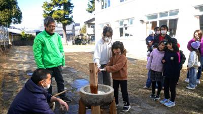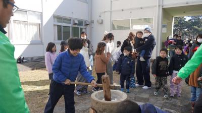 2月1日(日)、おやじの会のみなさんが「もちつき会」を開いてくれました。 もちつきをした後は、できたてのおもちを食べました。「おいしい」とみんな大喜び。家族のふれあいにもなり、とてもよい機会でした。