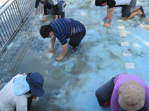 水泳の授業を実施するかは未定ですが、授業ができるように、プールの準備を進めています。昨年度はコロナウイルス感染症の影響でプールを使わなかったため、例年とは異なる2年分の汚れがどれほどのものか心配されました。そのため職員でプールの清掃を始めることとしました。予想通り、例年にない汚水の量で1日目(6月9日)は、汚水を排水溝に流すことで終わりました。写真は清掃2日目(6月10日)。例年はデッキブラシでとる底の汚れをたわしでこすって落としている様子が写っています。