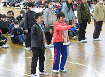 これまでの自分の成長を新聞にまとめ、将来へ向かう漢字一文字について、発表を行いました。とても緊張している様子が伝わってきましたが、一生懸命発表することができました。