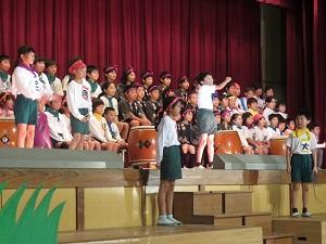 4年生は、総合的な学習で調べたことや、2年生と行った福岡ウォークで学んだことなどを、劇や歌にして発表しました。みんなで一生けんめい練習し、心を一つにして発表しました。