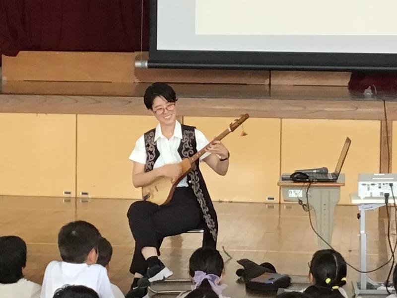 キルギスの学校で子どもたちが習うコムズという楽器の演奏を聴いたり、キルギス版ラジオ体操をみんなで体験しました。
