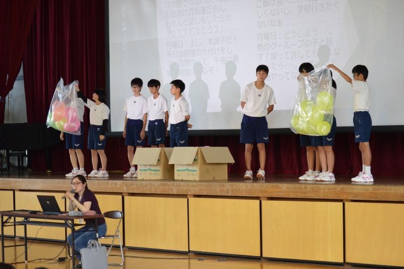 学校保健委員会を行いました 投稿日時 : 2019/10/10 主担 カテゴリ:今日の出来事 5,6時間目を使って、学校保健委員会を行いました。PTA会長さん、スクールカウンセラーの方にもご協力いただきました。最初に教室で「インターネットの使い方」についてのアンケートに答え、体育館に移動しました。保健委員が司会を行い、クイズなども交えてわかりやすく説明してくれました。スクールカウンセラーの先生からは、「依存」についての話を、保健委員による風船を使った説明でわかりやすく教えていただきました。先生たちの、中学時代の悩みや、恋話も聞けて、楽しく学ぶことができました。 {{options.likeCount}} {{options.likeCount}}