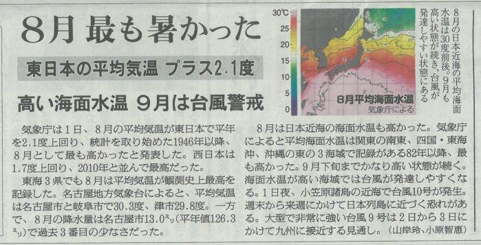 海面温度上昇 投稿日時 : 2020/09/02 主担 カテゴリ:今日の出来事 (令和2年9月2日 朝日新聞より) 8月は猛暑続きでとても暑かったです。そして、海面温度が30度前後となっており、気温でいうと『真夏日』状態です。海面温度が高いことは台風が発達しやすい状態となっています。台風10号も日本の南に発生し、スーパー台風となって日本に上陸する可能性も出てきました。しっかりと警戒をしたいです。 {{options.likeCount}} {{options.likeCount}}