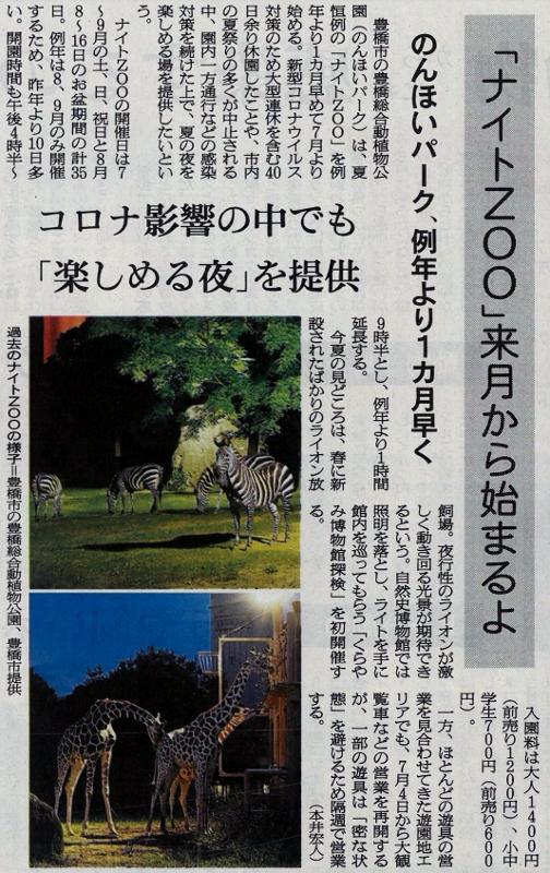 ナイトZOO 投稿日時 : 2020/07/03 主担 カテゴリ:今日の出来事 (令和2年6月26日 朝日新聞より) 豊橋動植物総合公園で、明日7月4日から「ナイトZOO」が始まります。夜間の開園時間は、午後4時半から午後9時半までとなります。料金はちょっと高めです。 {{options.likeCount}} {{options.likeCount}}