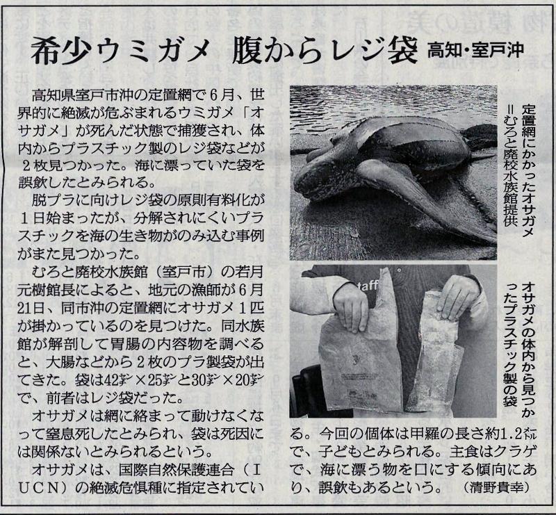 海の生き物に優しく 投稿日時 : 2020/07/05 主担 カテゴリ:今日の出来事 (令和2年7月4日 朝日新聞より) 絶滅危惧種の「オサガメ」が、高知県室戸市沖の定置網に引っかかり、死んだ状態で発見されました。解剖したところ、オサガメの体内からは、プラスチック製の袋が発見されました。自分たちが何も考えずにしていた行動や活動で、生物を危機に陥らせていることがあります。自分たちにできることを考えていきましょう。 {{options.likeCount}} {{options.likeCount}}