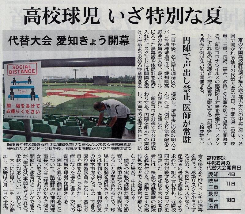 高校野球愛知県大会開幕 投稿日時 : 2020/07/04 主担 カテゴリ:今日の出来事 (令和2年7月4日 中日新聞より) 高校球児にとっての甲子園の道は閉ざされましたが、代替の大会となる愛知県大会が開幕します。今日は雨が心配ですが、高校生の思いの丈を出し切る闘いを見守りたいです。 {{options.likeCount}} {{options.likeCount}}