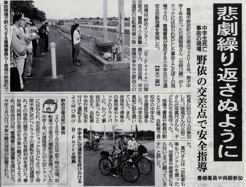 悲劇を繰り返さない 投稿日時 : 2020/07/04 主担 カテゴリ:今日の出来事 (令和2年7月4日 東愛知新聞より) 2年前、豊橋市の中学生が自転車に乗っており、大型トラックにはねられるという痛ましい事故が起きました。今年、愛知県では死亡事故が増加し、全国でワースト1位となっています。ヘルメットの着用や自転車の運転など十分に注意しましょう。 {{options.likeCount}} {{options.likeCount}}