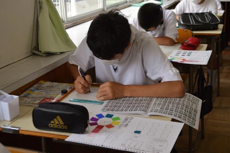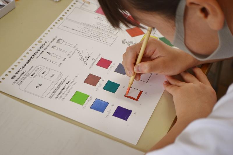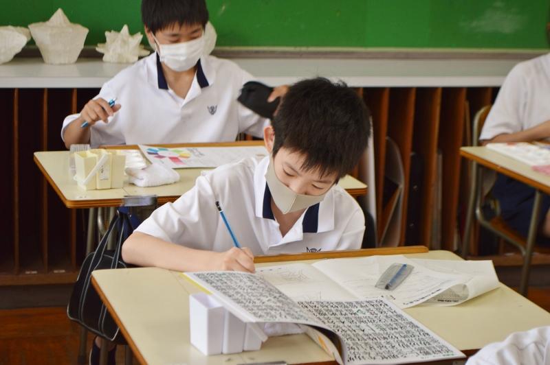 美術の授業では 投稿日時 : 2020/06/24 主担 カテゴリ:今日の出来事 1年生の美術の授業では、色塗りの練習を行ったり、漢字のレタリングをしたりしました。 {{options.likeCount}} {{options.likeCount}}