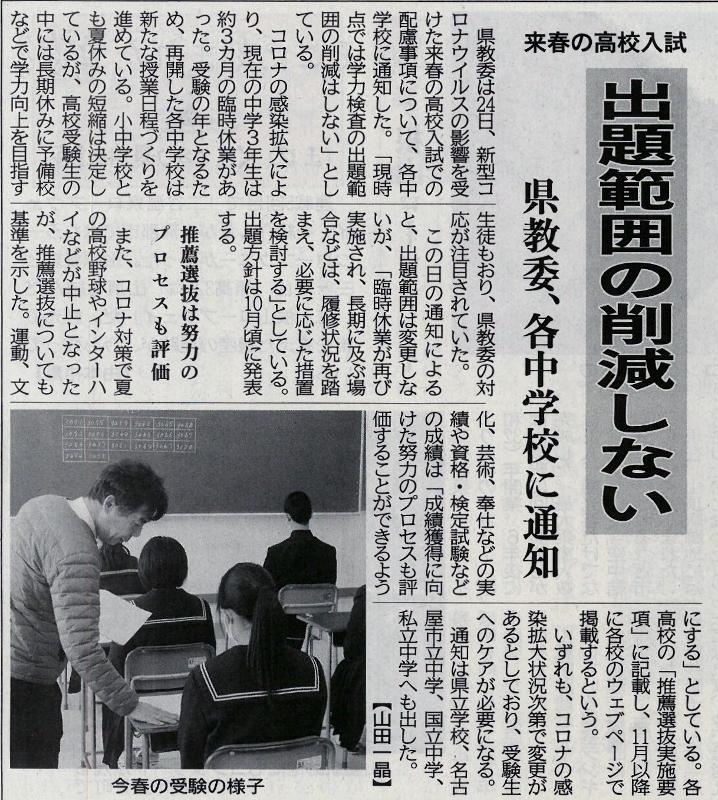 公立高校入試範囲変わらず 投稿日時 : 2020/06/25 主担 カテゴリ:今日の出来事 (令和2年6月25日 東愛知新聞より) 愛知県教育委員会は、現在の中学3年生が受検する来春の公立高校入試の学力検査の出題範囲を削減しない方針を出しました。豊橋市の方針で、夏休みも2週間程に短くなりましたし、現在二川中学校では7時間授業を行うなどして対応しています。 {{options.likeCount}} {{options.likeCount}}