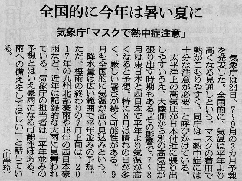 暑い夏に 投稿日時 : 2020/06/25 主担 カテゴリ:今日の出来事 (令和2年6月25日 朝日新聞より) 今年の夏も暑くなるという3カ月予報が出ました。新型コロナウイルス感染拡大防止のために、マスク着用している人が多く熱中症が心配です。先日、長崎で1時間に110ミリ以上の雨が降ったばかりですが、豪雨も心配です。 {{options.likeCount}} {{options.likeCount}}