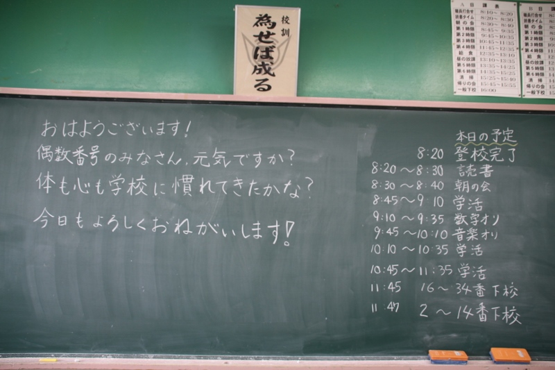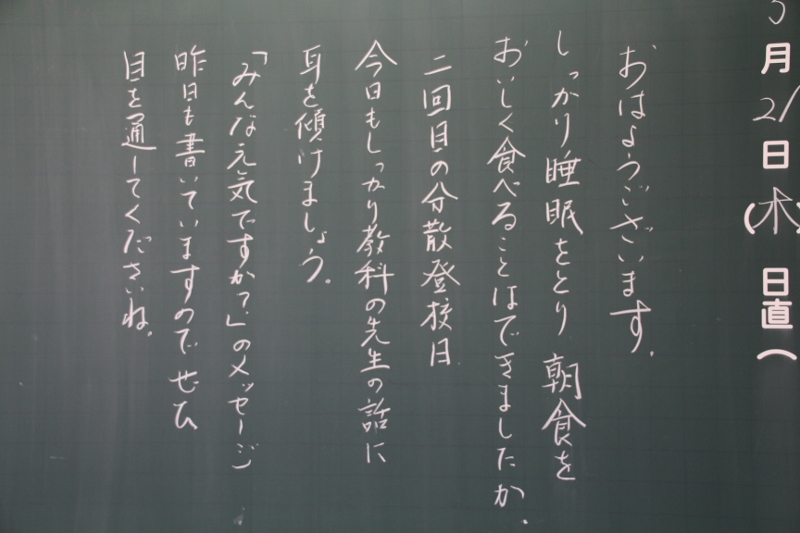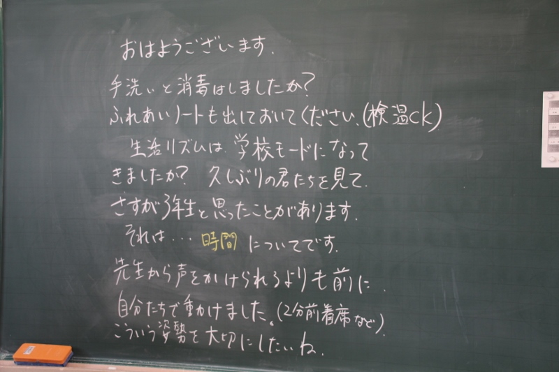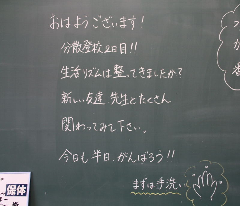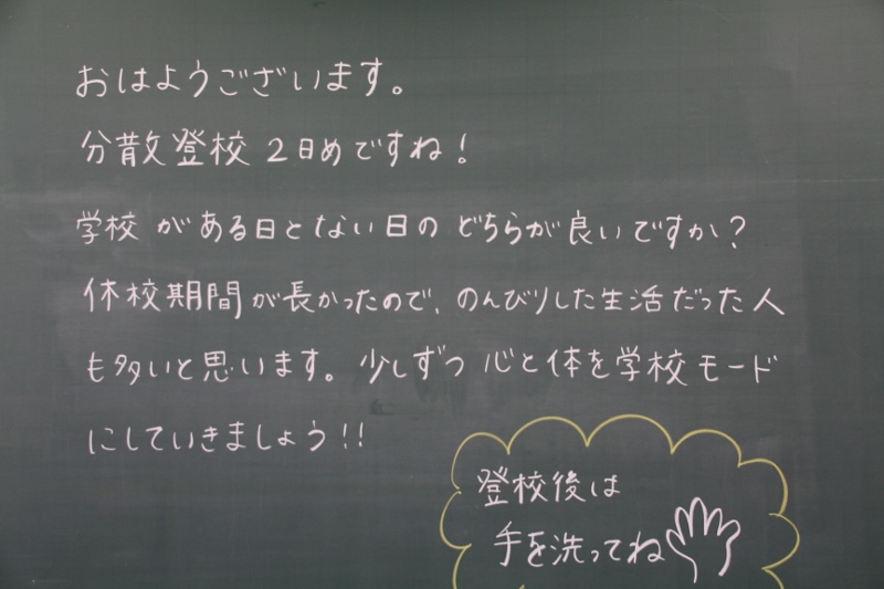 日々の様子 全ての記事 全ての記事 カテゴリ 今日の出来事 連絡事項 報告事項 ミーティング 本・雑誌 ニュース 映画・テレビ 音楽 スポーツ パソコン・インターネット ペット 総合学習 アニメ・コミック アーカイブ 2026年4月 (4) 2026年3月 (5) 2026年2月 (2) 2026年1月 (4) 2025年12月 (5) 2025年11月 (2) 2025年10月 (18) 2025年9月 (4) 2025年8月 (2) 2025年7月 (1) 2025年6月 (5) 2025年5月 (17) 2025年4月 (8) 2025年3月 (6) 2025年2月 (3) 2025年1月 (7) 2024年12月 (4) 2024年11月 (5) 2024年10月 (16) 2024年9月 (14) 2024年8月 (3) 2024年7月 (5) 2024年6月 (6) 2024年5月 (16) 2024年4月 (8) 2024年3月 (9) 2024年2月 (7) 2024年1月 (8) 2023年12月 (8) 2023年11月 (9) 2023年10月 (21) 2023年9月 (18) 2023年8月 (3) 2023年7月 (14) 2023年6月 (16) 2023年5月 (26) 2023年4月 (13) 2023年3月 (0) 2023年2月 (0) 2023年1月 (0) 2022年12月 (0) 2022年11月 (0) 2022年10月 (0) 2022年9月 (0) 2022年8月 (0) 2022年7月 (0) 2022年6月 (0) 2022年5月 (0) 2022年4月 (0) 2022年3月 (0) 2022年2月 (0) 2022年1月 (0) 2021年12月 (0) 2021年11月 (0) 2021年10月 (0) 2021年9月 (1) 2021年8月 (0) 2021年7月 (1) 2021年6月 (30) 2021年5月 (5) 2021年4月 (6) 2021年3月 (100) 2021年2月 (108) 2021年1月 (105) 2020年12月 (106) 2020年11月 (120) 2020年10月 (82) 2020年9月 (97) 2020年8月 (91) 2020年7月 (110) 2020年6月 (95) 2020年5月 (151) 2020年4月 (119) 2020年3月 (100) 2020年2月 (53) 2020年1月 (48) 2019年12月 (65) 2019年11月 (73) 2019年10月 (50) 2019年9月 (19) 2019年8月 (4) 2019年7月 (7) 2019年6月 (15) 2019年5月 (15) 2019年4月 (12) 2019年3月 (13) 2019年2月 (17) 2019年1月 (10) 2018年12月 (16) 2018年11月 (27) 2018年10月 (22) 2018年9月 (29) 2018年8月 (4) 2018年7月 (6) 2018年6月 (8) 2018年5月 (13) 2018年4月 (11) 2018年3月 (0) 2018年2月 (1) 2018年1月 (0) 2017年12月 (0) 2017年11月 (0) 2017年10月 (3) 10件 1件 5件 10件 20件 50件 100件 夜店も中止に 投稿日時 : 2020/05/22 主担 カテゴリ:今日の出来事 (令和2年5月22日 東愛知新聞より) 6月の豊橋の恒例の行事といえば納涼まつり、通称夜店が中止となりました。毎年、大変混雑して密集、密接になるので、できるかどうか心配していました。楽しみにしていた生徒も多いと思うので残念です。 {{options.likeCount}} {{options.likeCount}} 2時間目 投稿日時 : 2020/05/22 主担 カテゴリ:今日の出来事 2時間目、2・3年生は、生徒会役員選挙を行いました。各教室で、動画で立候補者の演説を見て、投票を行いました。とても静かに行いました。1年生は、体育館で学年集会を行いました。全員マスクをして、前後と隣の距離を十分にとって行いました。学年主任の熱い思い、担任紹介などを行いました。 {{options.likeCount}} {{options.likeCount}} 1時間目 投稿日時 : 2020/05/22 主担 カテゴリ:今日の出来事 1時間目には、始めの会を行いました。校長先生のお話では、学級のテレビでパワーポイントを使い、学校の目標や変更となったテストや行事などについての話がありました。そして、2・3年生の代表生徒の言葉、先生の紹介ビデオを見ました。 {{options.likeCount}} {{options.likeCount}} 初めての全員登校 投稿日時 : 2020/05/22 主担 カテゴリ:今日の出来事 初めて全員が登校してきました。分散登校で行ってきたように玄関での検温の確認と、生徒は荷物を置いた後に手洗いを行います。今朝、検温を忘れた生徒が9人いました。今週のことになりますが、家での検温を忘れて学校で検温を行い、発熱が確認されたため、登校してすぐに保護者に迎えに来ていただき下校となってしまった生徒もいました。ご家庭でお子様の健康状態を確認するとともに、他の生徒の安心安全のためにもご協力お願いします。登校後、生徒は担任の先生に検温の点検表を見せたり、2,3年生は静かに読書をしたりしていました。全員が学校に揃うと、やはり密集状態になることがわかります。教室の廊下側の緑の壁を取り外すなどの対策を行っています。愛知県では、中学1年生が35人以下の学級となっていますが、全国的には40人学級となっており、大変「密」な状態です。文部科学省の環境面での適切な対応を期待したいところです。 {{options.likeCount}} {{options.likeCount}} 各学級担任が工夫して子どもたちを迎えています 投稿日時 : 2020/05/21 主担 各学級担任の先生が書いた黒板メッセージです。IMG_1559 (800x533).jpgIMG_1561 (800x533).jpgIMG_1563 (800x533).jpgIMG_1564 (800x533).jpgIMG_1565 (800x533).jpgIMG_1566 (800x533).jpgIMG_1567 (800x533).jpgIMG_1568 (800x689).jpg {{options.likeCount}} {{options.likeCount}} アベノマスクが不必要な方はいらっしゃいませんか 投稿日時 : 2020/05/21 主担 カテゴリ:今日の出来事 (令和2年5月20日 朝日新聞より) 4月1日に発表された布マスク、通称「アベノマスク」の配布。愛知県でも配布がようやく始まったそうですが、みなさんのご自宅には届いたでしょうか。手作りマスクや不織布マスクを使用している方で、「アベノマスク」が不要な方は、マスク不足に悩んでいる介護施設や障害者施設に提供する活動を行っています。未開封の布マスクに限りますが、直接キョーワ薬局に届けるか、郵送でもよいそうです。 {{options.likeCount}} {{options.likeCount}} 熱中症に注意 投稿日時 : 2020/05/21 主担 カテゴリ